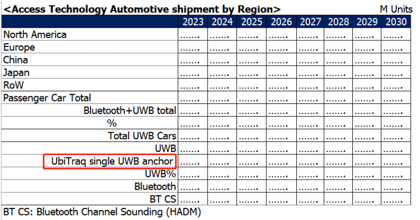 更重要的是,在新报告的汽车数字钥匙出货量预测中,全迹科技UWB-AOA产品被作为一项独立技术,与传统UWB、蓝牙钥匙并列(下表中的UbiTraq single UWB anchor),被单独预测其出货量与市场占有率。这是国际专业机构对全??萍夹幸盗煜鹊拇葱履芰Α⒓际跄芰τ氩纺芰Φ募笕峡?!