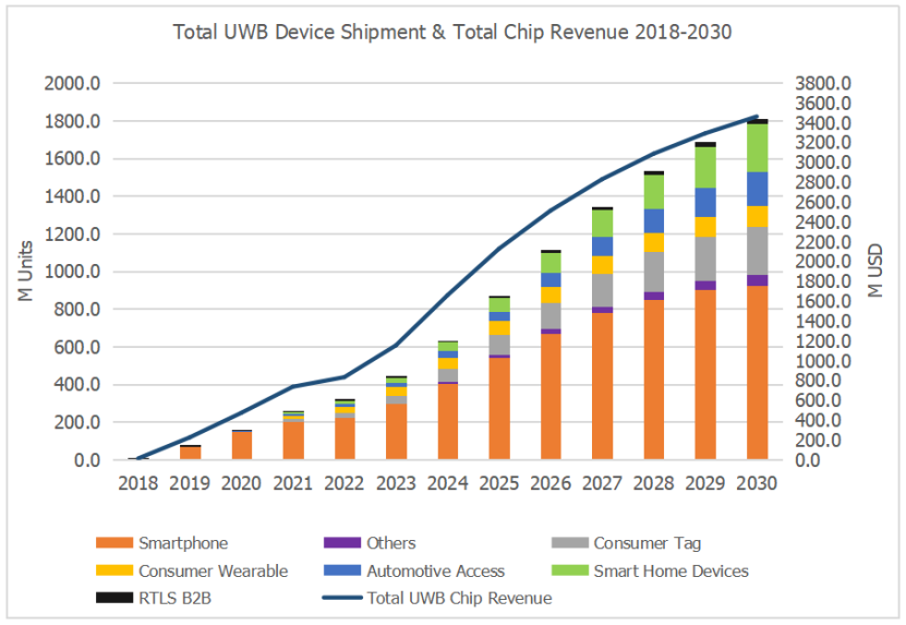 注:TSR(Techno Systems Research)是一家总部位于日本,面向全球的市场分析公司。TSR为客户提供多个高科技领域深入的市场研究报告。TSR历年发布了多份UWB市场分析报告,因其数据详实丰富而闻名。其专业的统计数据经常被全球各类UWB行业分析文章引用,例如下面这张来自2022年TSR报告的插图,相信行业内不少小伙伴都看过。